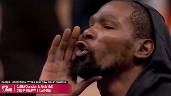 本场比赛也不例外,杜兰特登上球场后他也再度被球迷狂嘘,但是哭笑不得的是杜兰特在球场上反嘘了回去。在介绍球员登场时,杜兰特再度收到主场球迷的嘘声。